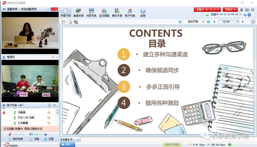5月16日下午,2018年长沙市中小学教师网络研修“高考改革背景下教育教学变革”和“师德师风”两个项目的中期学情直播会议在中国教师研修网顺利举行。长沙市的各级管理员、辅导教师(坊主)、学员共计一千多人通过电脑和手机两种方式收看了本次直播。本次学情会由中国教师研修网和长沙市中小学教师发展中心联合举办,直播由中国教师研修网编辑李姝静老师和都鹏芝老师主持。