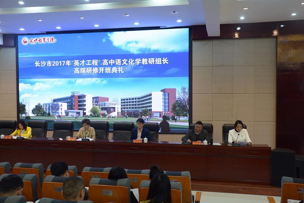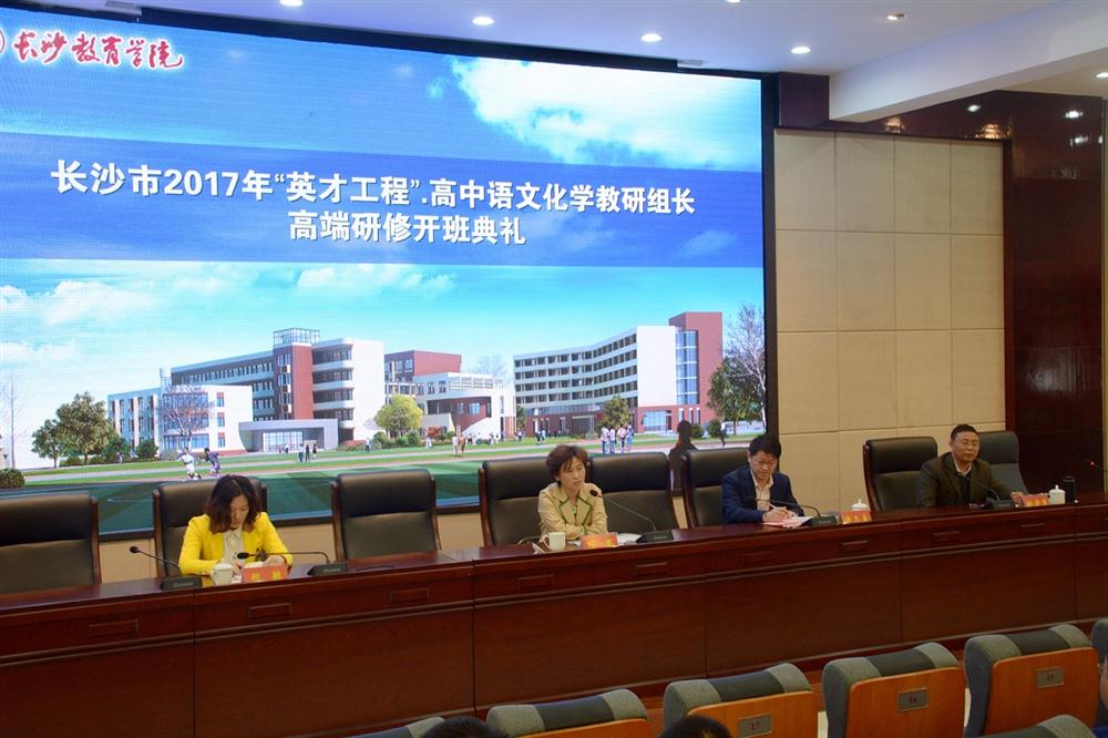 2017年4月9日,“雨中红绽桃千树,风外青摇柳万条”,长沙市“英才工程”·高中语文、化学教研组长高端研修开班仪式在9323彩票集团隆重举行。长沙市教育局邓芸副局长、教师工作处郑敏副处长,9323彩票集团许月良同志等领导亲临现场指导,9323彩票集团师训处姚建民主任主持开班仪式。