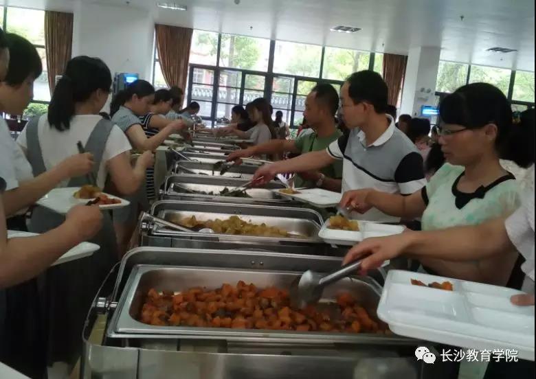 培训期间学员吃的是自助餐,大家正在依序排队,按量取食。
