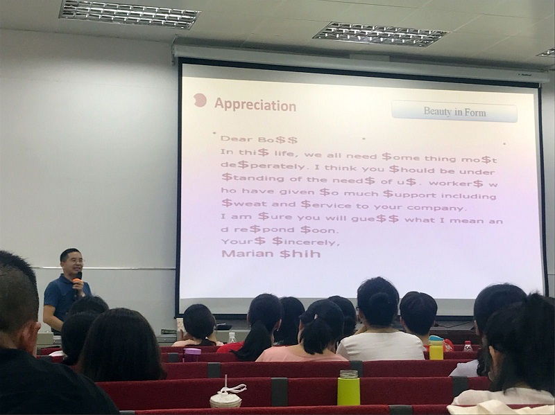 在三个小时的讲座中,刘东明教授从英语学科的核心素养讲起,阐述了语言能力、思维品质、学习能力和主要途径。他结合自己的教育、学习经历,以风趣的语言向学员们讲解了如何"用英语之美建构小学英语课堂",从音美、形美、意美三个方面深入讲解,列举了很多生动的例子。刘东明教授诙谐幽默的语言,不时博得了满堂喝彩。