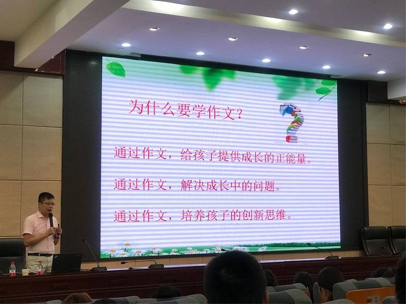 最后压轴出场的也是一位幽默风趣的男老师,他是来自武汉大学第一附属小学的董尚元老师。因为课程的安排,董老师在中午12点半就正式开讲,他幽默地表示今天最大的任务就是不要让在场的老师们睡着了,他本人则坚持全程站着授课。在余下的讲座时间中,老师们聚精会神听讲的样子告诉了董老师他的担心是多余的。董老师带来的讲座内容是《从"立言"到"立人"—核心素养观下的小学习作教学变革》。他提到了两种写作教学观:为了写作,通过写作,并让习作链接孩子们的生活,提出让创新走进习作教学生活,其间精彩的写作课例、视频穿插其间,"友情客串"的董老师儿子的童言童语,让人忍俊不禁。孩子们的成长,更让人感于董老师的用心与他的教育智慧。