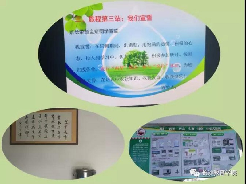 习总书记在十九大报告中提出要推进绿色发展,推进资源全面节约和循环利用,实施国家节水行动,降低能耗、物耗,实现生产系统和生活系统循环链接。倡导简约适度、绿色低碳的生活方式,反对奢侈浪费和不合理消费,开展创建节约型机关、绿色家庭、绿色学校、绿色社区和绿色出行等行动。走进校园,我们很快就感觉到了学院践行习总书记绿色发展理念的举措:号召“创建‘两型’示范学校 做美丽中国行动者”,推出“践行‘两型’理念 实施‘绿色’体验式培训”展板,发出“实施绿色体验式培训”倡议,要求落实《公民生态环境行为规范(试行)》。 开学典礼上,肖万祥院长要求将“绿色”理念渗透到培训管理的各个方面。在班级的破冰活动中,又举行了“践行两型理念,参与绿色体验”的集体宣誓仪式,我们加深了对“绿色体验式培训”理解,感觉到学院的用心良苦,真是润物无声!