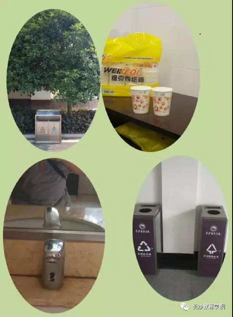 校园风景无处不在,只要你善于观察就能发现:一个个分类垃圾回收桶,温馨提示你“爱护环境,从我做起”;一个个感应水龙头时时提醒你节约用水;一个签有专属主人名字的一次性纸质杯提醒你拒绝一次性用品……处处彰显“资源节约”的理念,让我们无时无处不在体验“绿色”生活。