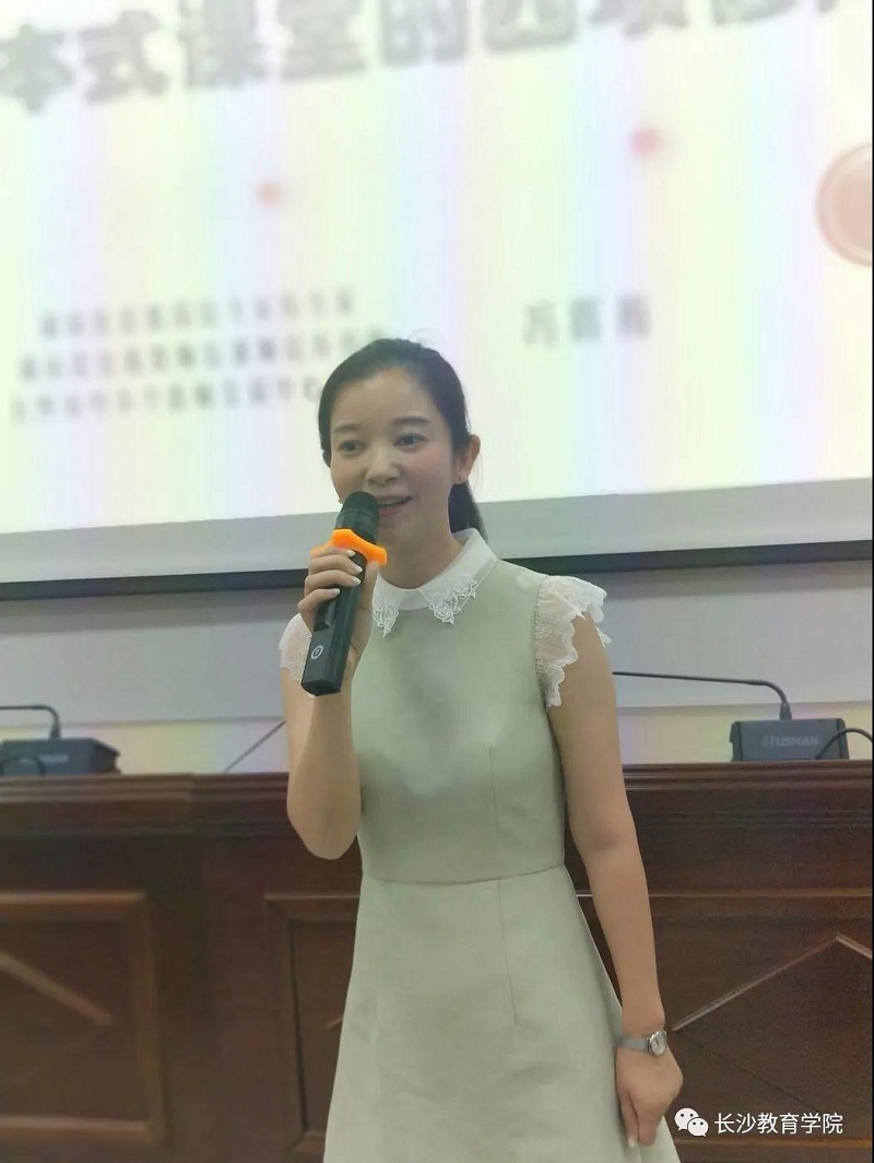 长郡双语易贵兰老师分享"语言的建构与运用"。她言辞诚朴,通过咬文嚼字让学生“学得”、“习得”,明白“纸上得来终觉浅,绝知此事要躬行”;通过智慧创新感悟“落霞与孤鹜齐飞,秋水共长天一色”的美妙。