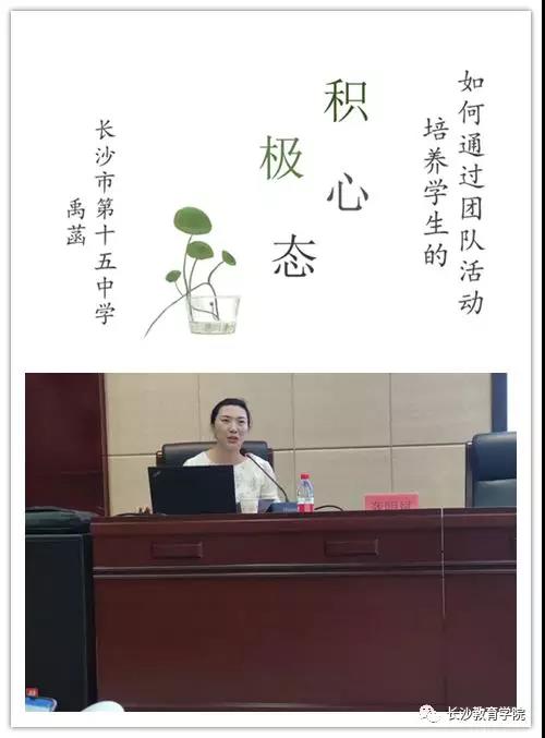 一开始进行的是学员分享,同题异构。来自长沙市第十五中学的禹菡老师演讲的主题是如何通过团队活动培养学生的积极心理。她认为教师首先应该根据学生不同阶段的不同特点,尊重规律,清晰规划。初一跨入少年期,保留着小学生的特点,易受外界影响,应加强班级凝聚力,培养习惯与心态。初二进入青春期,比较逆反,易出现不良行为,抵制成人。加强心理疏导,平稳度过“青春期”。初三心理日趋成熟,有很强的升学紧迫感,渴望被尊重与理解。强化复习策略,培养应考心态。
