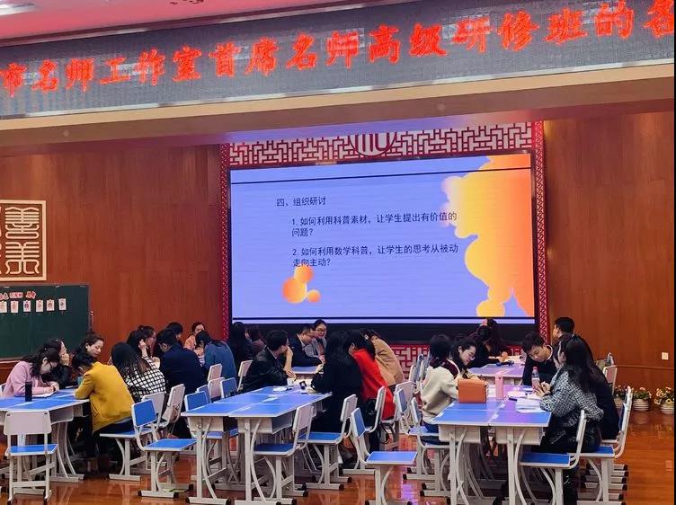 我们小组的覃婕老师走到台上,走到工作室成员的讨论中去。在交流中她了解到在座的许多老师,都是特级教师,骨干教师,怀揣着对于数学教学的热爱,两年前这一群人相聚在一起,在这两年中,他们抱团成长、每月一聚,每组轮流上示范课,在交流学习中共同进步。